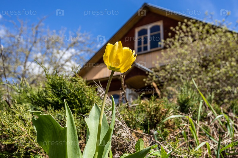 Вид снизу желтого тюльпана на заросшем дворе