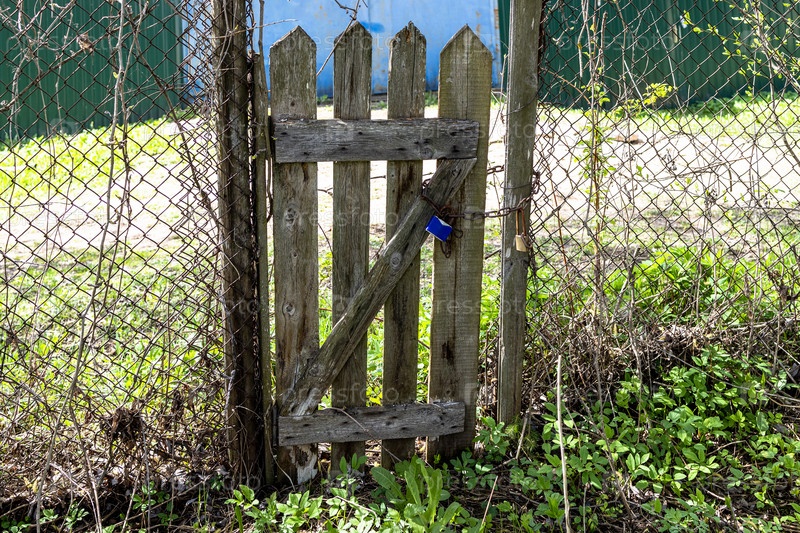 Закрытая старая ветхая деревянная калитка на заднем дворе