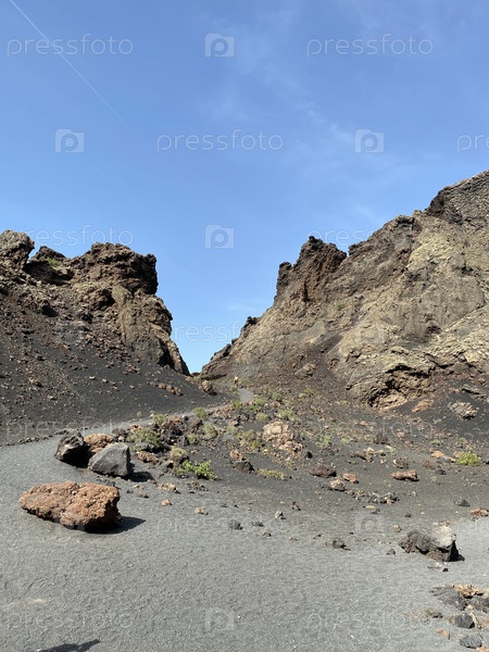Огромная кальдера потухшего вулкана, покрытая черным вулканическим песком острова Лансароте