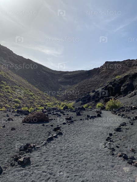 Огромная кальдера потухшего вулкана, покрытая черным вулканическим песком острова Лансароте