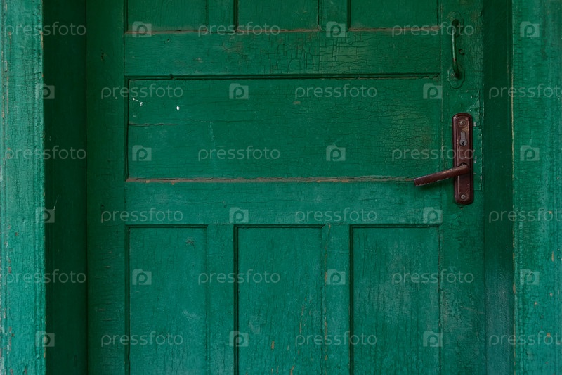 Фрагмент старой зеленой деревянной двери деревенского дома. Потрескавшаяся краска на досках. Две дверные ручки