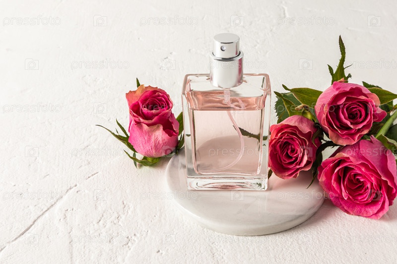Шикарный стеклянный флакон духов или туалетной воды стоит на круглом мраморном подиуме с чайными розами. Презентация аромата. Копия пространства
