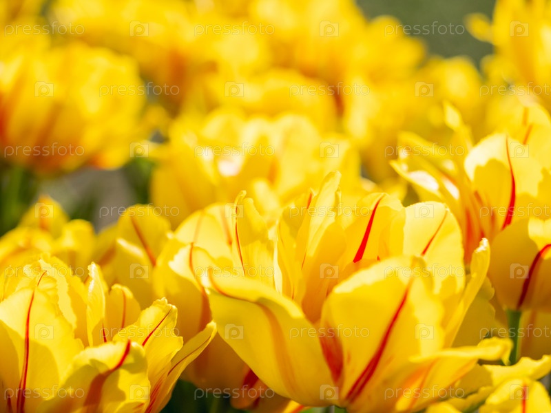 Естественный весенний фон с цветущими тюльпанами. Красивые многолетние желтые цветы цветут среди зеленых листьев