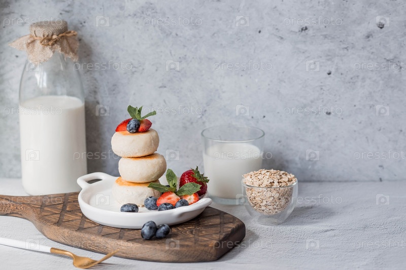 Блинчики с творогом, русские сырники со свежей черникой, клубникой и мятой на стильной деревянной доске на сером бетонном столе. Натуральные продукты. Здоровый и вкусный завтрак