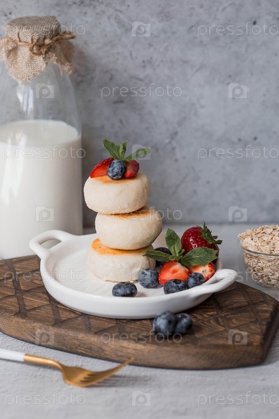 Блинчики с творогом, русские сырники со свежей черникой, клубникой и мятой на стильной деревянной доске на сером бетонном столе. Натуральные продукты. Здоровый и вкусный завтрак