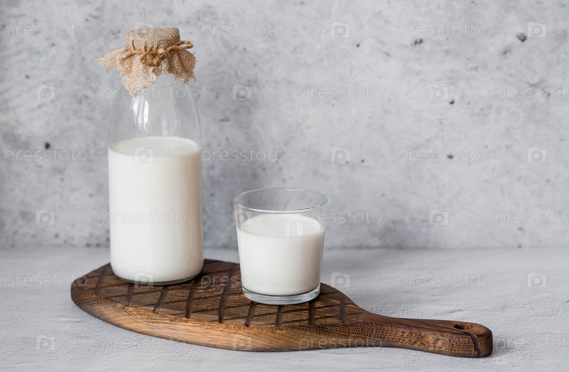 Органическое натуральное коровье молоко в стеклянной бутылке и стакане на стильной деревянной доске на каменном столе. Натуральные экологически чистые продукты