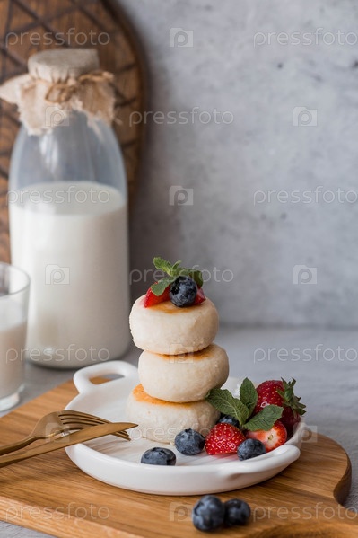 Блинчики с творогом, русские сырники со свежей черникой, клубникой и мятой на стильной деревянной доске на сером бетонном столе. Натуральные продукты. Здоровый и вкусный завтрак