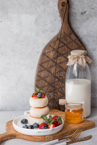 Блины с творогом, русские сырники со свежей черникой, клубникой, медом и листьями мяты на стильной деревянной доске на сером бетонном столе. Натуральные продукты. Здоровый и вкусный завтрак