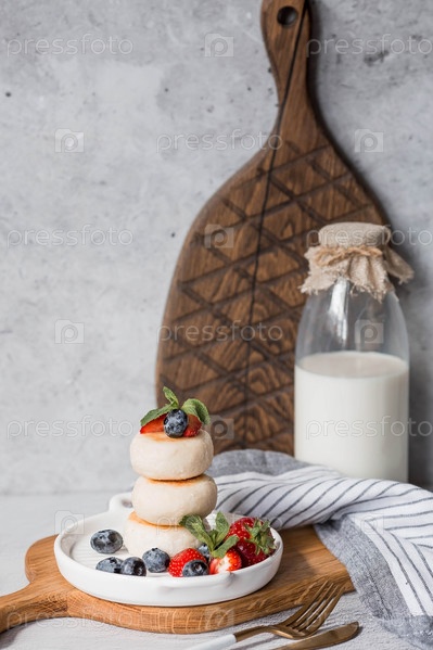 Блинчики с творогом, русские сырники со свежей черникой, клубникой и мятой на стильной деревянной доске на сером бетонном столе. Натуральные продукты. Здоровый и вкусный завтрак