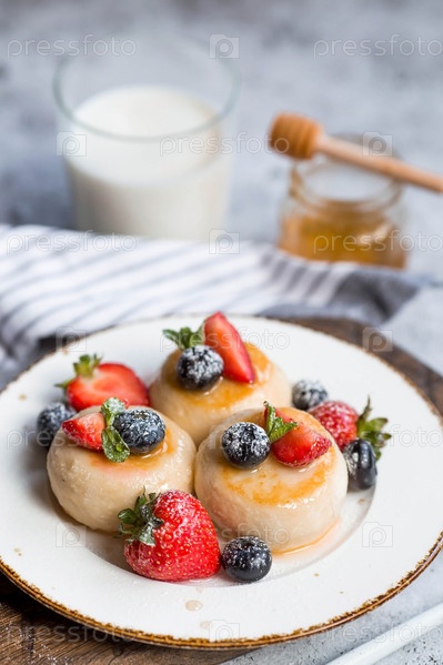 Блины с творогом, русские сырники со свежей черникой, клубникой, медом и листьями мяты на стильной деревянной доске на сером бетонном столе. Натуральные продукты. Здоровый и вкусный завтрак