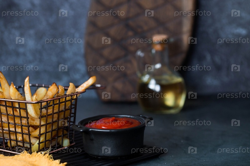 Картофель фри в металлической корзине с солью, кетчупом и подсолнечным маслом на стильной доске на темном фоне. Жареная картошка. Концепция фаст-фуда и нездоровой пищи