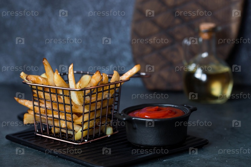 Картофель фри в металлической корзине с солью, кетчупом и подсолнечным маслом на стильной доске на темном фоне. Жареная картошка. Концепция фаст-фуда и нездоровой пищи