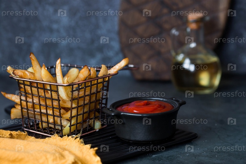 Картофель фри в металлической корзине с солью, кетчупом и подсолнечным маслом на стильной доске на темном фоне. Жареная картошка. Концепция фаст-фуда и нездоровой пищи