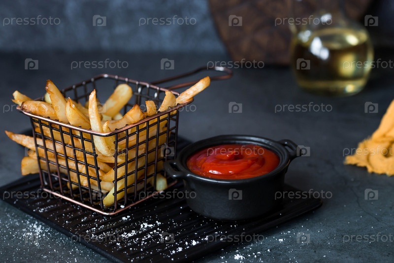 Картофель фри в металлической корзине с солью, кетчупом и подсолнечным маслом на стильной доске на темном фоне. Жареная картошка. Концепция фаст-фуда и нездоровой пищи