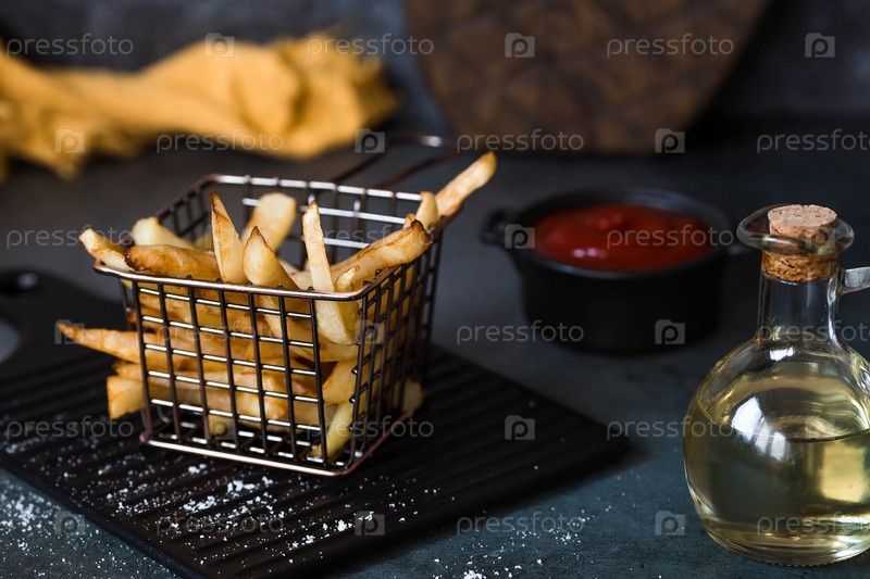 Картофель фри в металлической корзине с солью, кетчупом и подсолнечным маслом на стильной доске на темном фоне. Жареная картошка. Концепция фаст-фуда и нездоровой пищи