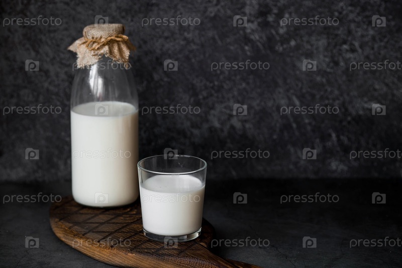 Органическое натуральное коровье молоко в стеклянной бутылке и стакане на стильной деревянной доске на каменном столе. Натуральные экологически чистые продукты