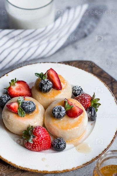 Блины с творогом, русские сырники со свежей черникой, клубникой, медом и листьями мяты на стильной деревянной доске на сером бетонном столе. Натуральные продукты. Здоровый и вкусный завтрак