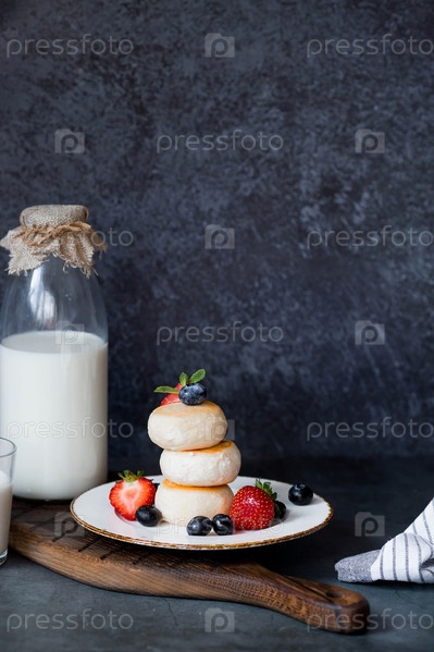 Блинчики с творогом, русские сырники со свежей черникой, клубникой и листьями мяты на стильной деревянной доске на темном фоне. Натуральные продукты. Здоровый и вкусный завтрак