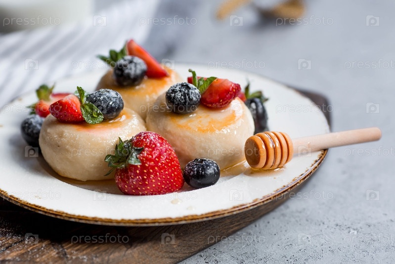 Блины с творогом, русские сырники со свежей черникой, клубникой, медом и листьями мяты на стильной деревянной доске на сером бетонном столе. Натуральные продукты. Здоровый и вкусный завтрак