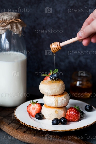 Блины с творогом, русские сырники со свежей черникой, клубникой, медом и листьями мяты на стильной деревянной доске на темном фоне. Натуральные продукты. Здоровый и вкусный завтрак