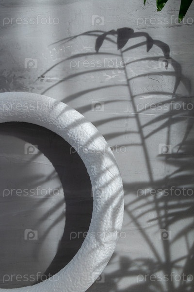 Белый геометрический круг с тенью пальмового листа и естественным солнечным светом на фоне серого бетона