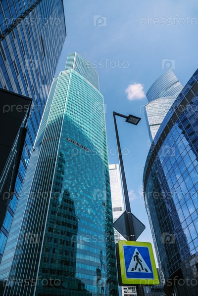 Небоскребы в деловом районе Москва-Сити. Вид снизу вверх на башни на фоне голубого неба. Москва. Россия