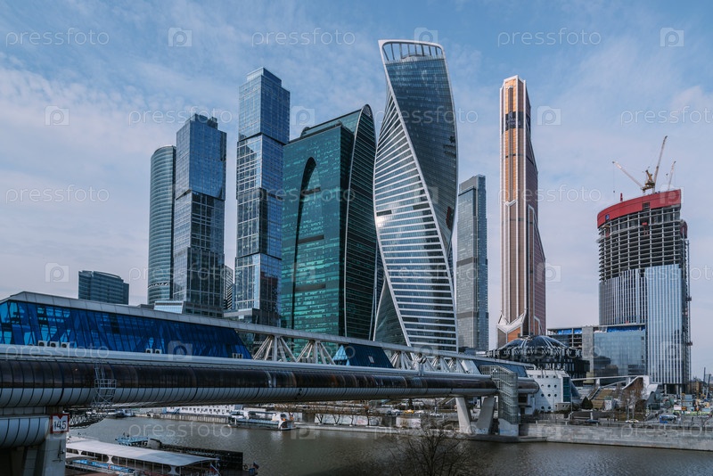 Пешеходный мост Багратион на Москве-реке на фоне небоскребов Москва-Сити. Москва. Россия