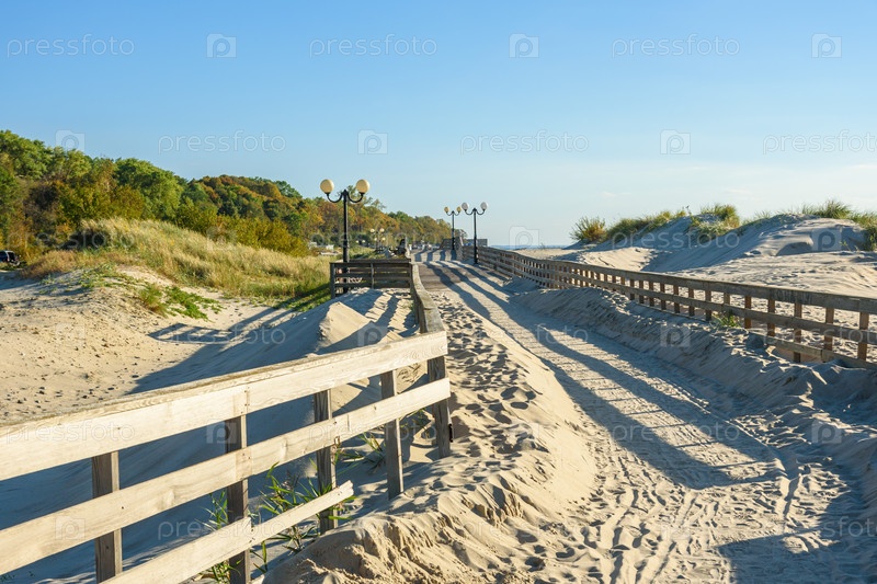 Длинная деревянная набережная вдоль побережья Балтийского моря. Янтарный. Калининградская область. Россия