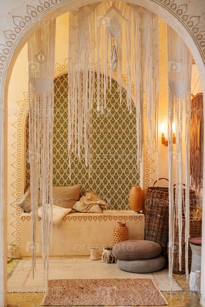 Марокканский стиль интерьера в бежевых тонах с аркой, украшенной ткаными деталями бохо, подушками на диване у стены с витиеватым узором