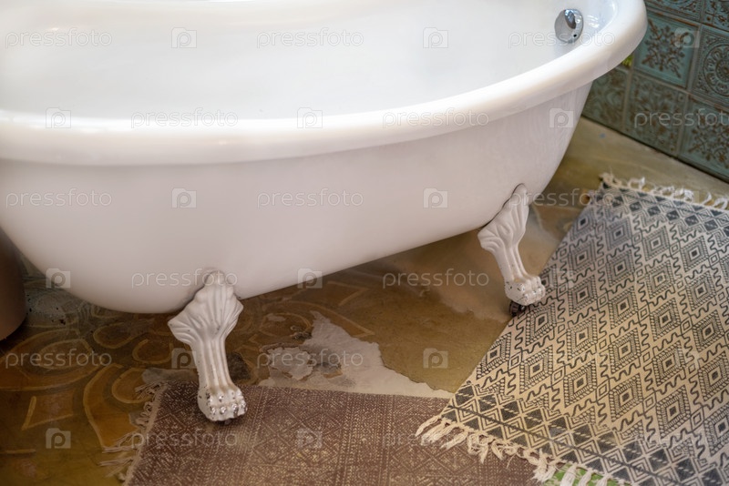 Крупный план винтажной белой ванны на ногах на ветхом полу ванной комнаты в стиле ретро домашний интерьер