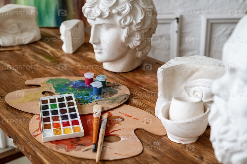 Деревянное рабочее место художника с палитрами, кистями, акварельным набором и гипсовой моделью головы аполлона