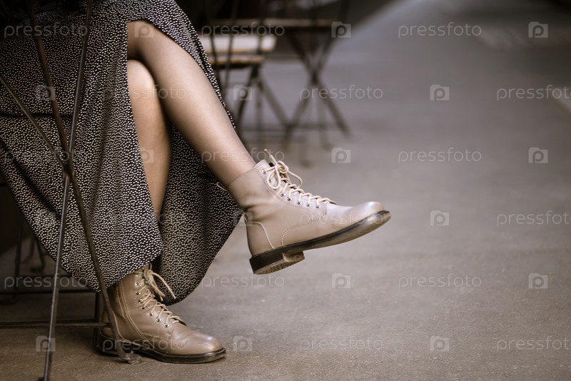 Женщина, одетая в стильную юбку и повседневные сапоги, сидит в уличном кафе