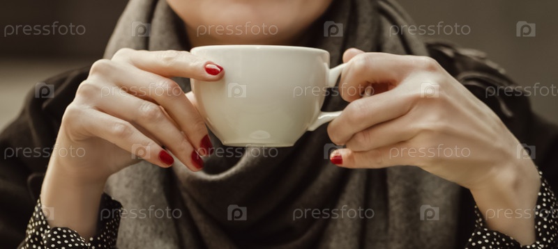 Крупным планом женские руки с красным маникюром, держа чашку кофе, винтажные тона