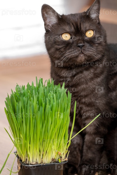 Кошка ест свежие зеленые ростки овса, натуральные травяные средства для домашних животных