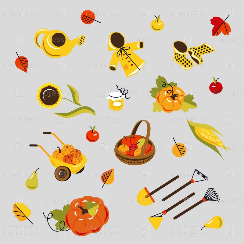 Осень в саду, садовые инструмент, тачка с тыквами, корзина яблок, подсолнух, банка с вареньем