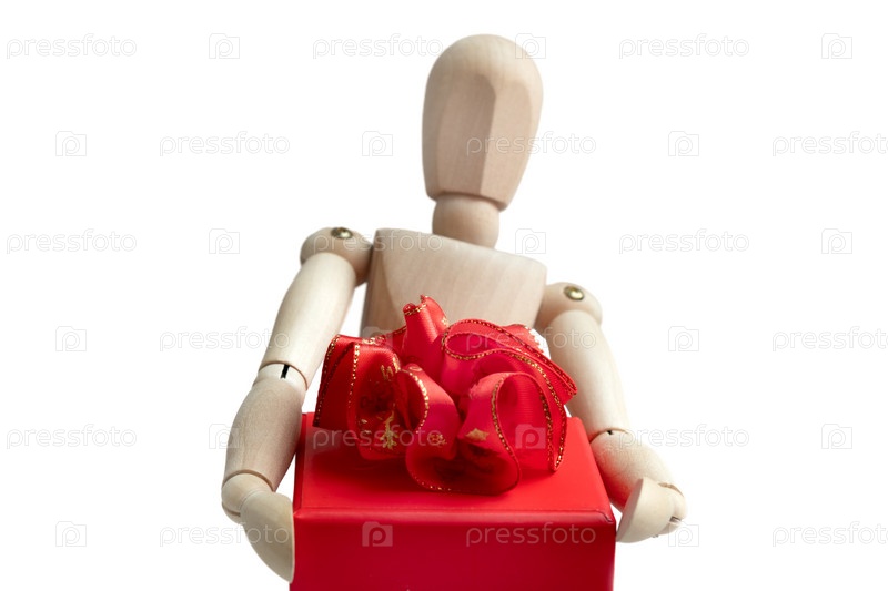 Деревянный манекен держит подарочную коробку с красным бантом