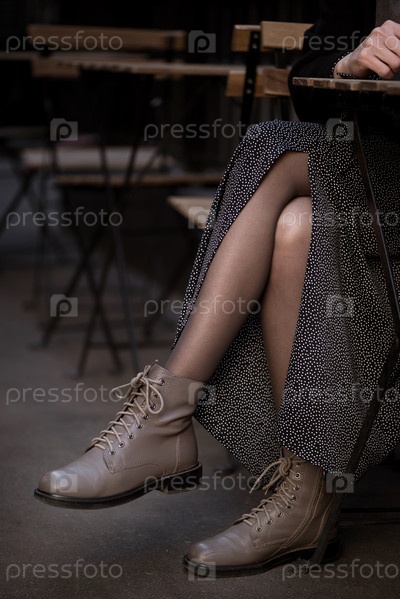Крупным планом скрещенные ноги женщины в кожаных сапогах, сидящей в уличном кафе