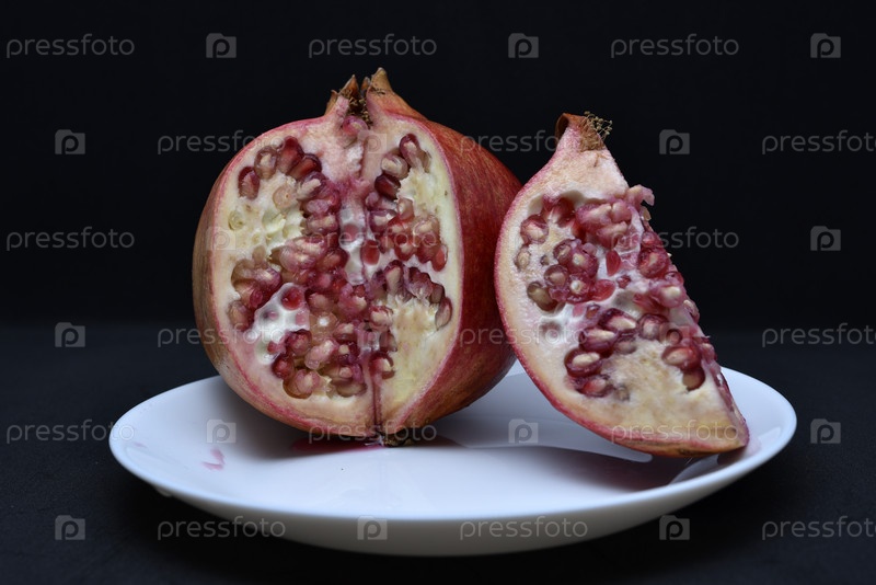 Плоды граната на белой тарелке. Вкусный плод граната. Нарезать фрукты