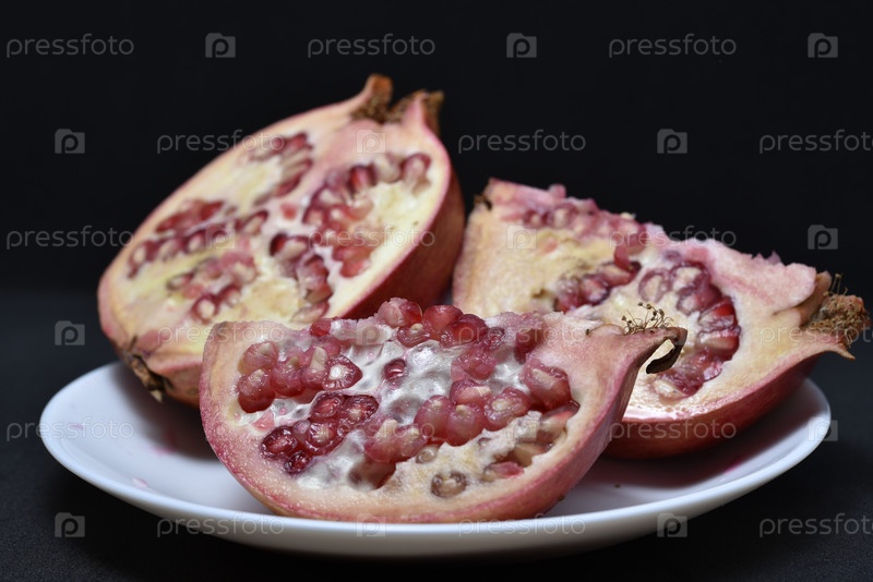 Плоды граната на белой тарелке. Вкусный плод граната. Нарезать фрукты