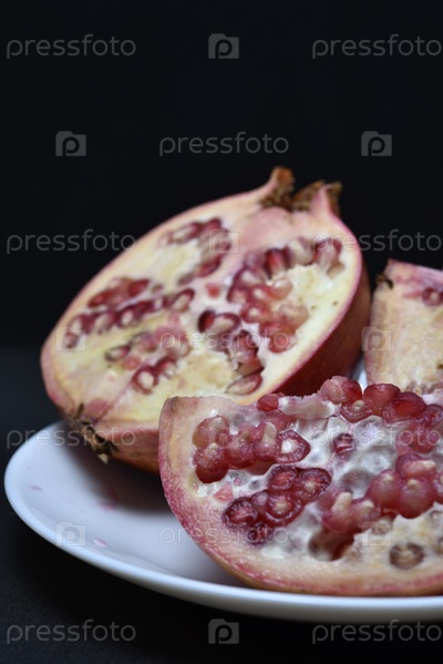 Плоды граната на белой тарелке. Вкусный плод граната. Нарезать фрукты