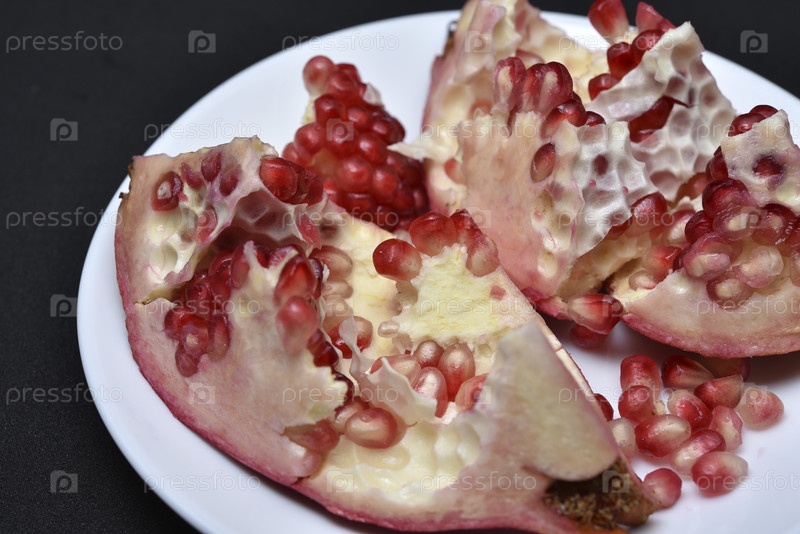 Плоды граната на белой тарелке. Вкусный плод граната. Нарезать фрукты