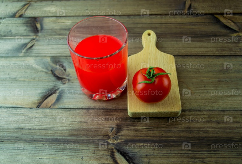 Помидор и томатный сок на темном деревянном столе