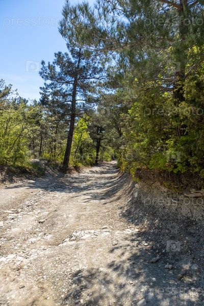 Проселочная дорога проходит через смешанный лес. Солнечное и голубое небо