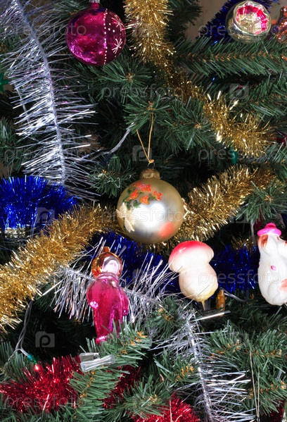 Игрушки на зеленой рождественской ели