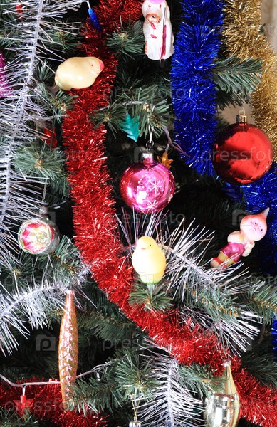 Игрушки на зеленой рождественской ели