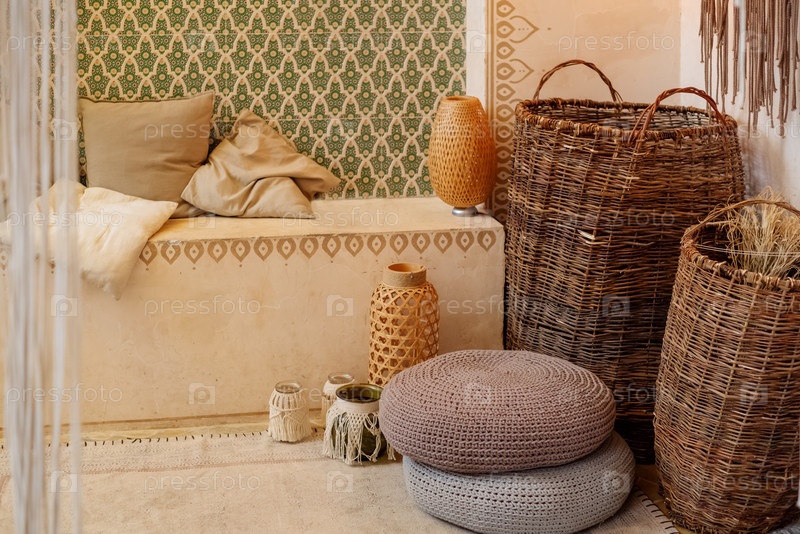 Детали интерьера Ближнего Востока в бежевых тонах с украшением в стиле бохо, подушки на диване у стены с богато украшенным узором