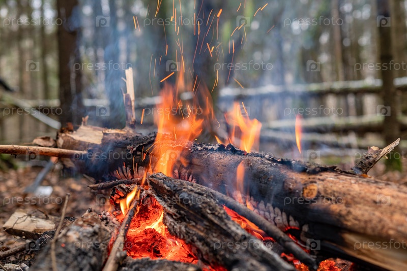 Горящий костер и яркие искры, летящие от тлеющих углей