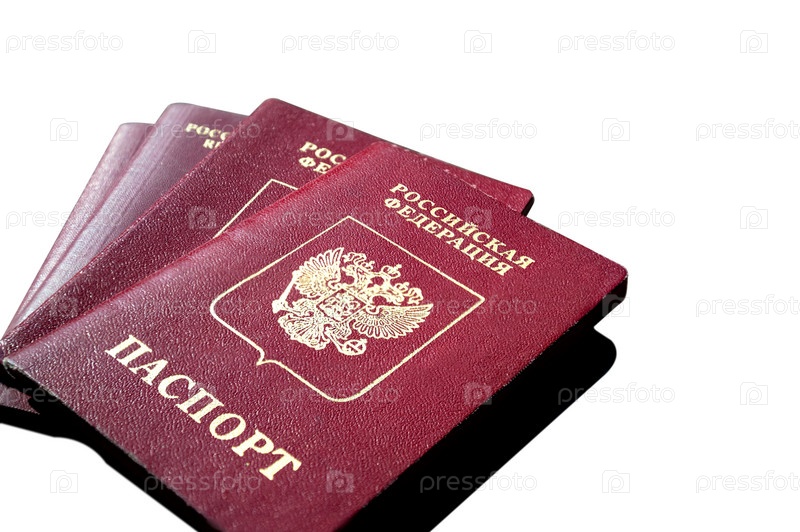 Стопка российских паспортных документов, выделенных на белом фоне (перевод: Российская Федерация)