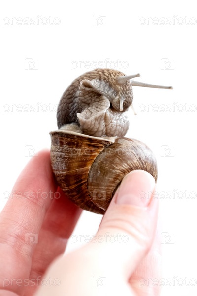 Большая улитка сидит в спиральном улитке в человеческой руке