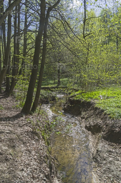 Река Чертановка в верхнем течении. Битцевский лесопарк, Москва. Солнечный день в начале мая